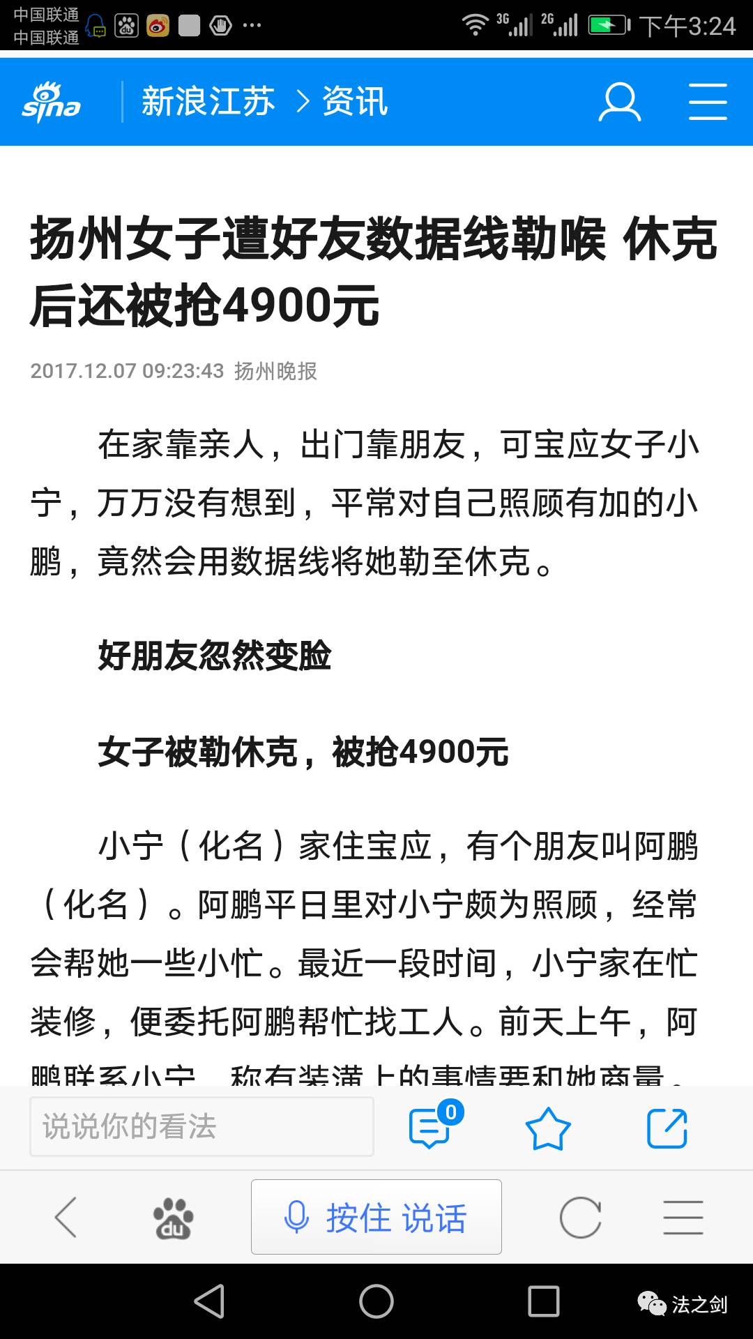 今天,在“新浪江苏”上看到了这样一条新闻:扬州一女子遭好友数据线勒喉,休克后还被抢去4900块钱。