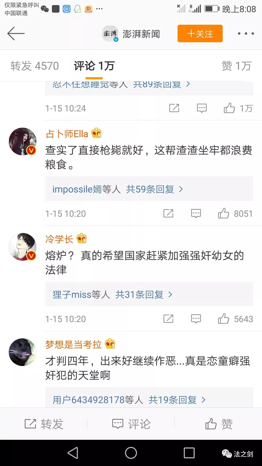 大家看出来了吗?实际上部分网民已经把这起案件看成强奸幼女了,他们把标题中的性侵理解成了强奸。很显然,澎湃新闻标题中的“长期性侵”几个字吸引了读者,读者聚焦到性侵二字,整个节奏乱了。于是乎,这帖子很快就几万的评论、几百万的阅读量,标题算是“成功”了,小编要不要颁个二等奖?
