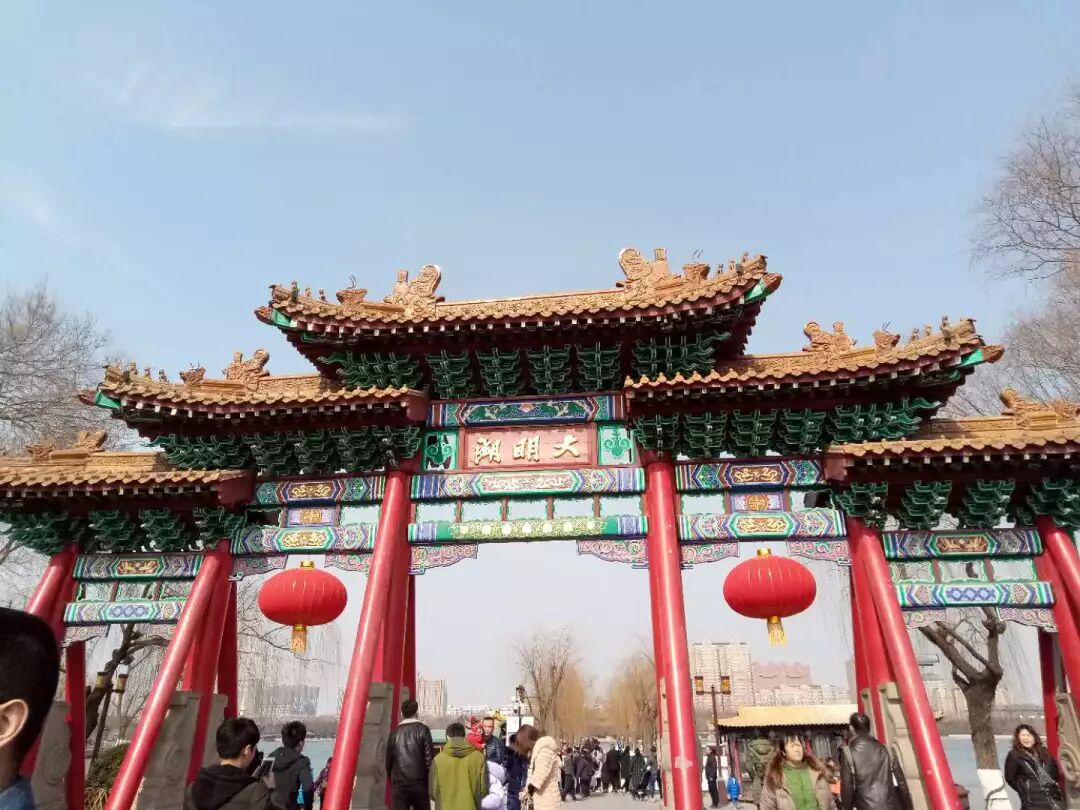 富丽堂皇,飞檐翘背的设计,看上去雄伟壮观,极有气势。尤其是匾额上题写的“大明湖”三个鎏金大字,在正午阳光的映照下,格外光彩夺目,熠熠生辉。