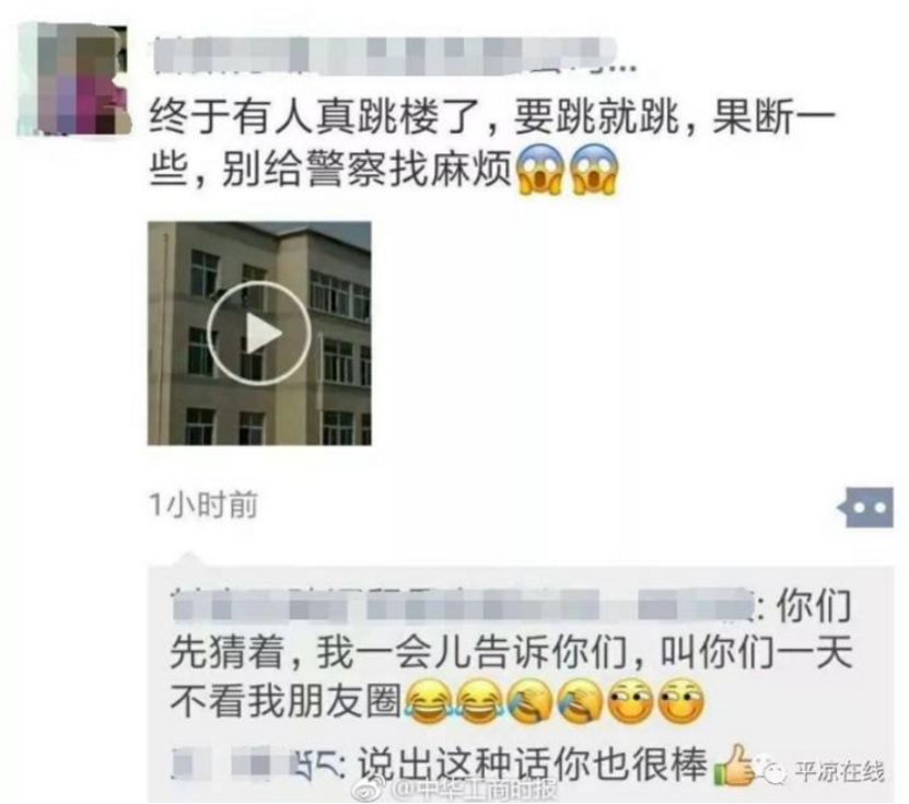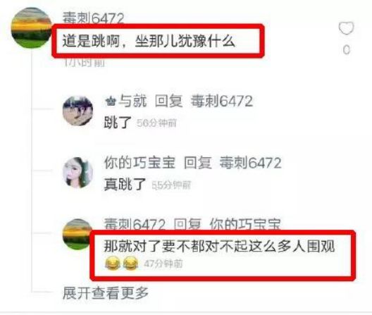 女孩跳下之后,女孩的鲜血和瞬间消逝的生命也没能换回围观者的良知。一名之前发帖“倒是跳啊,坐那犹豫什么”的网友,竟然在女孩跳下后写道:那就对了,要不都对不起这么多人围观。