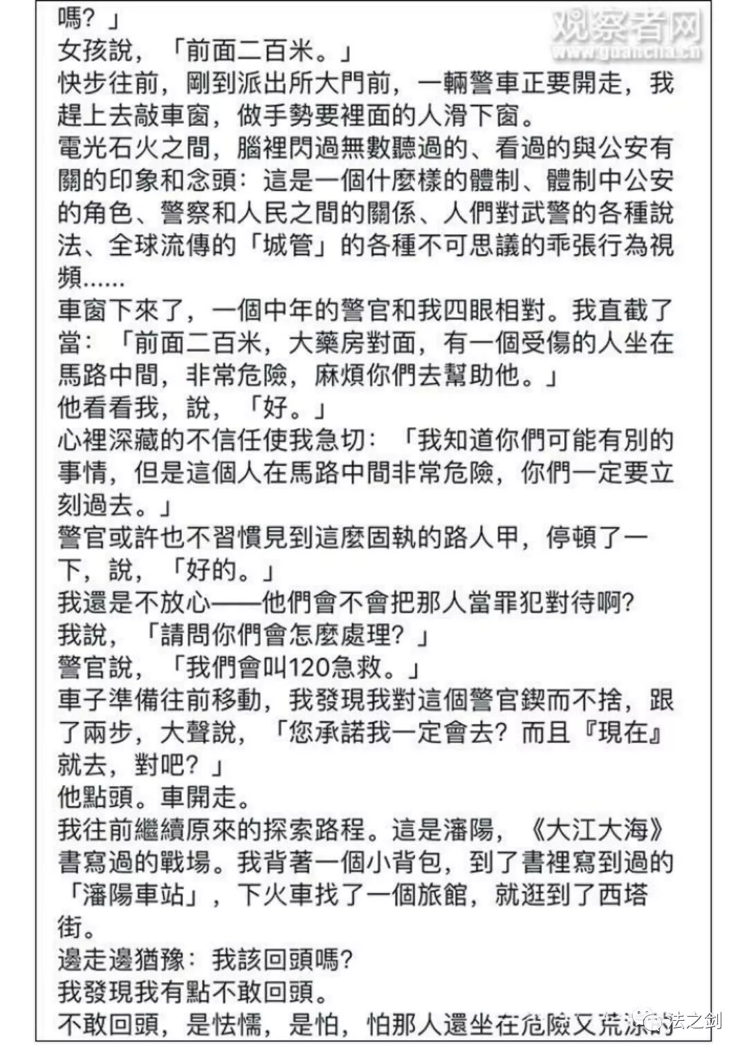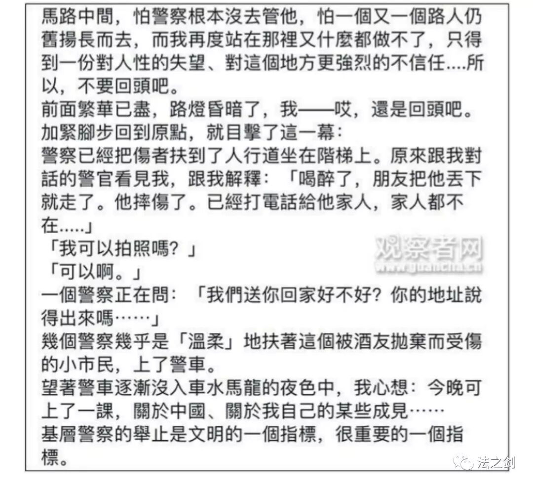 而龙应台呢,因为“心里深藏的不信任”,认为警察根本没去管他,或者就像路人一样,应付一下,就扬长而去了,所以,她决定“杀个回马枪”。当她返回时,她看到,警察已经把该受伤的男子扶到了人行道旁的阶梯上。原来,该男子是喝醉了被酒友抛弃而受的伤。现场的警察,不停打电话给他家人,却联系不上。最终,几位警察几乎是“温柔”地扶着该醉酒男子,上了警车,并亲自送他回家。