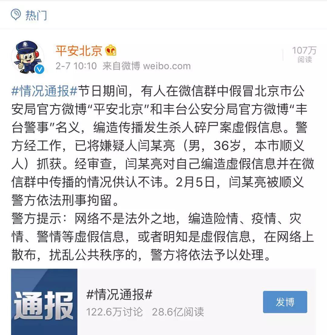 果不其然,2月7日上午,北京警方通过官方微博发布了信息表示:“节日期间,有人在微信群中假冒北京市公安局官方微博“平安北京”和丰台公安分局官方微博“丰台警事”名义,编造传播发生杀人碎尸案虚假信息。警方经工作,已将嫌疑人闫某亮(男,36岁,本市顺义人)抓获。经审查,闫某亮对自己编造虚假信息并在微信群中传播的情况供认不讳。2月5日,闫某亮被顺义警方依法刑事拘留。”