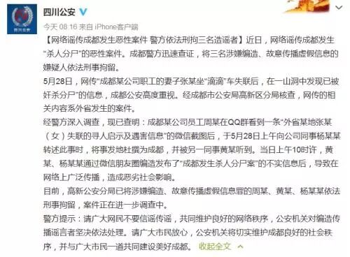 造谣碎尸的案例,还真不止顺义的这一位。18年5月网传“成都某公司职工的妻子张某坐车失联后,在一山洞中发现已被奸杀分尸”的信息,就把成都警方给忙得团团转。经过迅速查证,成都警方将三名涉嫌编造、故意传播虚假信息的嫌疑人依法刑事拘留。
