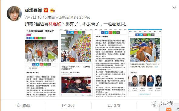 我看的《扫毒2》是昨日下午2点40开始放映的,散影后,看到大妈粉丝“孤烟暮蝉”3点15分发了个关于《扫毒2》的微博:扫毒2里边有林嘉欣?那算了,不去看了,一粒老鼠屎。