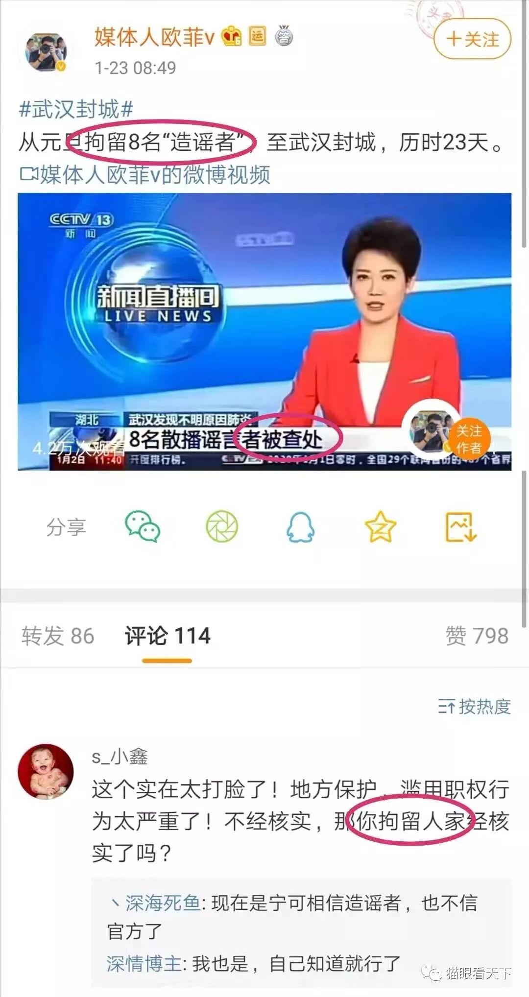 先是捏造事实报道,报道说武汉警方拘留了8个人,随后又说这8个人的谣言其实是一个幸事,因为他们所造成的恐慌是好事,我们应该对这样的虚假信息宽容。宽容到什么程度?本该可以拘留的,没有拘留,而是批评教育,还要怎么样宽容?要不要武汉警方跪下来感谢他们的谣言,让大家恐慌得戴上口罩了、对抗击疫情作出了巨大的贡献?