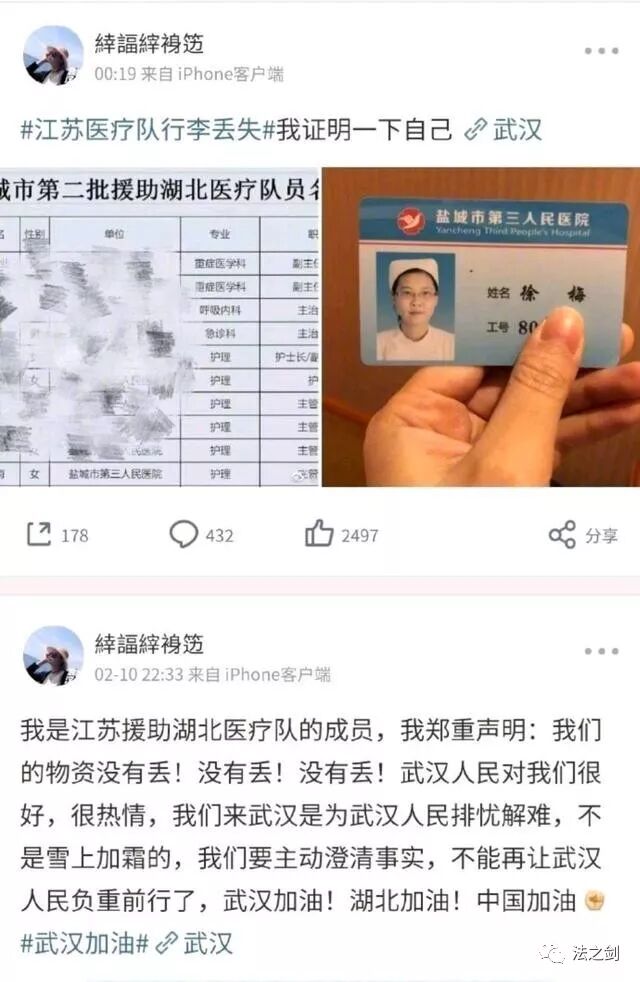 此前,有网友爆料“湖北哄抢江苏医疗支援队的行李物资”等传言。
