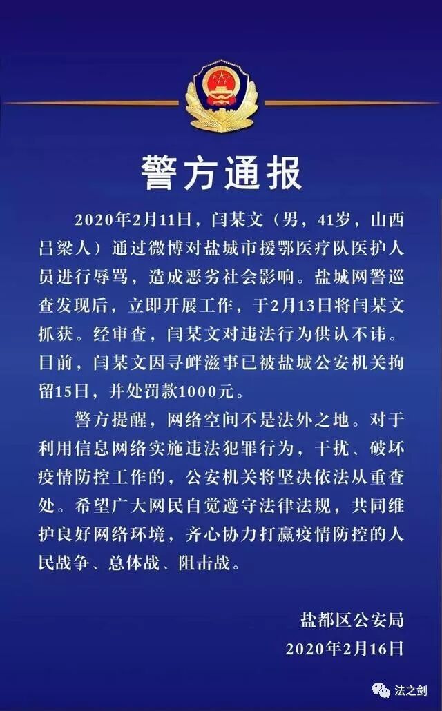 今天上午,微博粉丝“刺萼龙逵152”艾特我,我一看,她刚发了个微博:【盐城警方够铁腕,革命老区的范】网民闫x文因辱骂江苏援湖北医疗队医护人员,被盐城公安机关依法行政拘留15天,罚款1000元!另,该网民账号已被微博站方关闭!