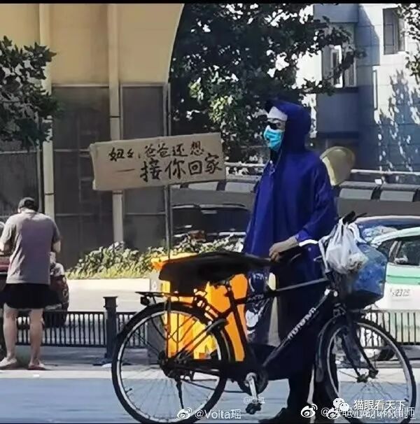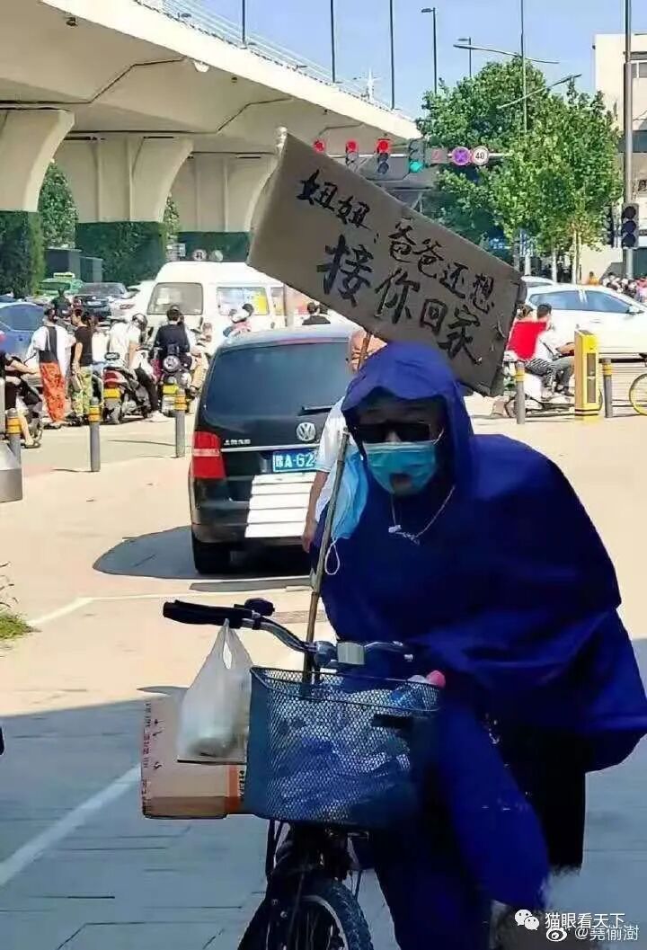 这个男子在炎炎烈日下,披着雨衣,雨衣的帽子也将他的头遮去大半,戴着墨镜和口罩,身边一部自行车,还有一块牌子,牌子上写着:妞妞,爸爸还想接你回家。