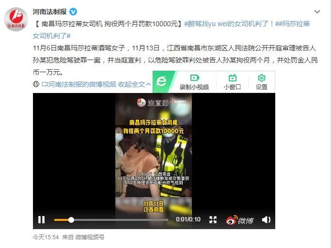 11月6日,南昌玛莎拉蒂酒驾女子事发;11月13日,江西省南昌市东湖区人民法院公开开庭审理被告人孙某犯危险驾驶罪一案,并当庭宣判,以危险驾驶罪判处被告人孙某拘役两个月,并处罚金人民币一万元。