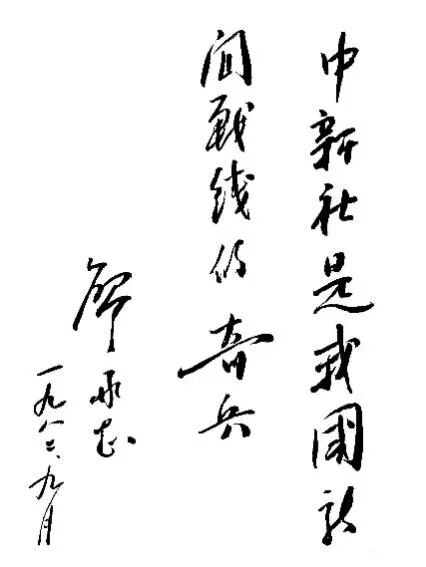 1982年9月,廖承志为中新社题词“中新社是我国新闻战线的奇兵”。