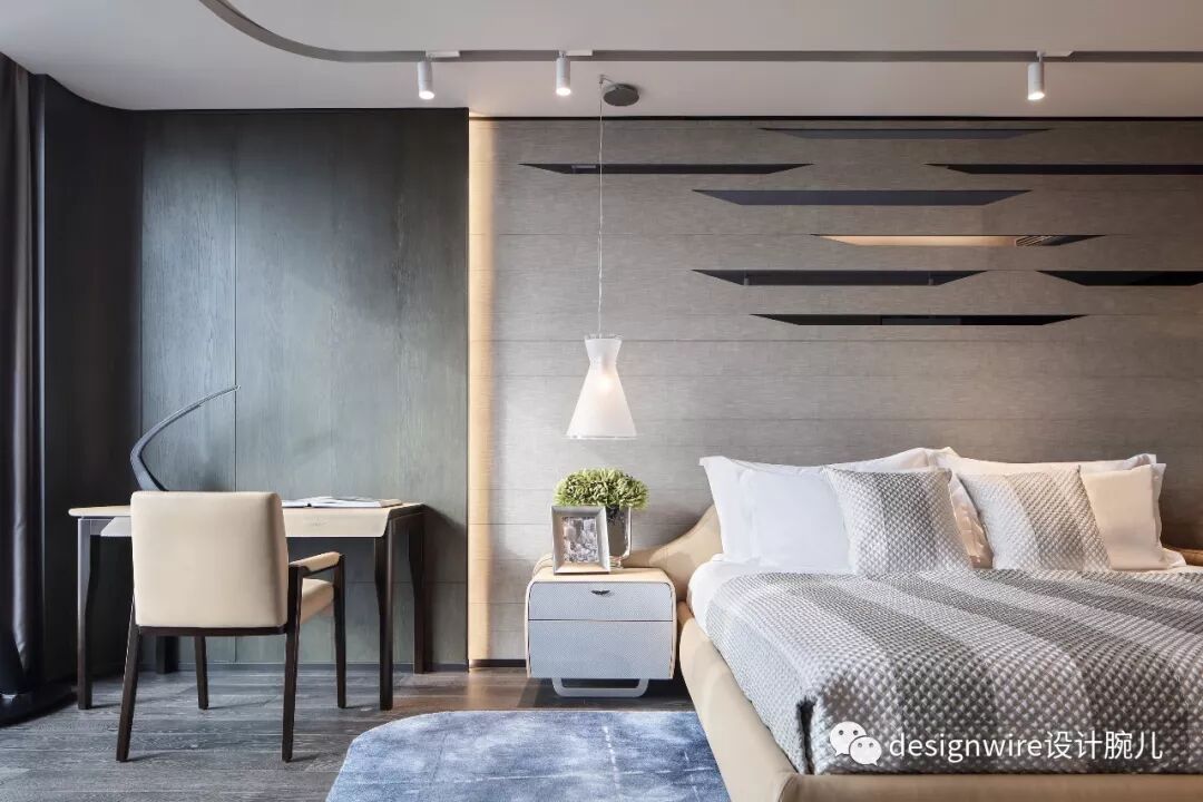 线条是简单和复杂的并存,简单在于它只是一根线,复杂在于它在千变万化中产生的各种设计语义,卧室的背景墙在线条的强弱、精细、穿插、排布中形成一种节奏韵律变化,亦是飞驰梦乡的具象体现。