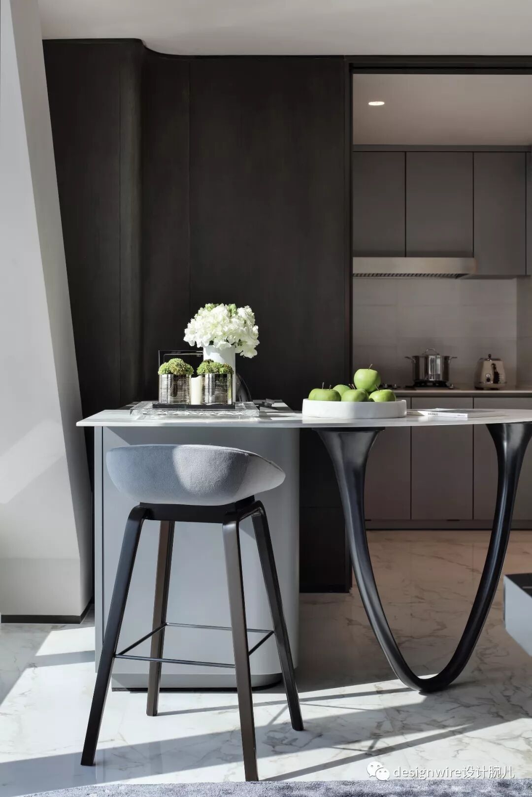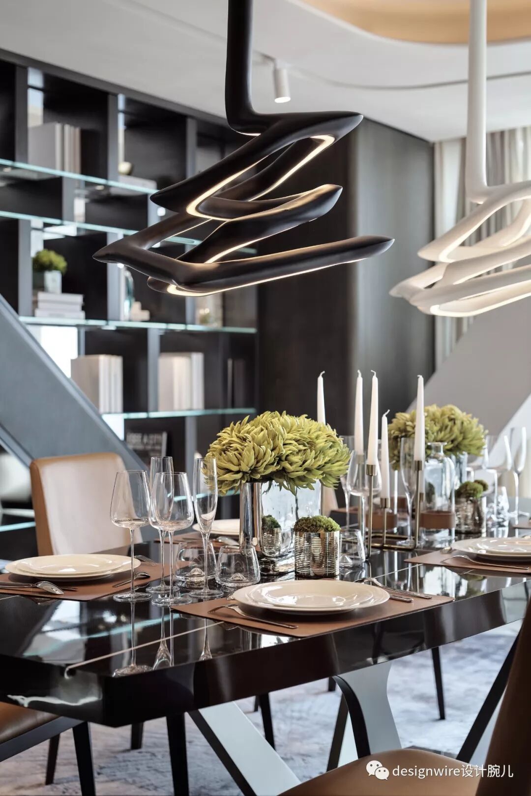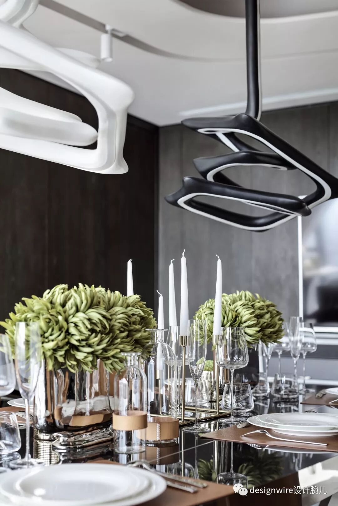 黑与白的碰撞,以一种难以调和却又达到极致后相互融合的特殊存在。黑白成为餐厅的主色调,线条旋绕的灯具勾勒超跑的赛道,顿折之间凝结力量之美。