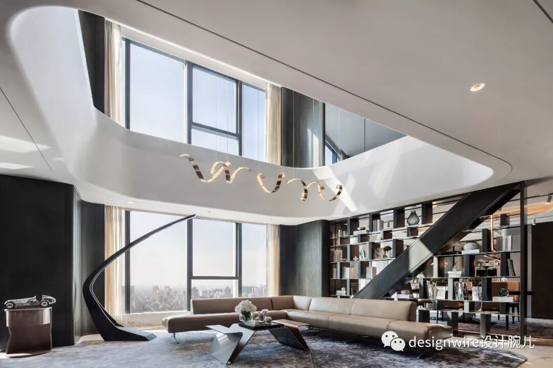 环绕挑空客厅的天花结构,车窗线条般流畅的落地灯,将客厅化车舱的无限延伸,而空间的支撑结构与落地灯一同勾勒出车窗外的城市风景。