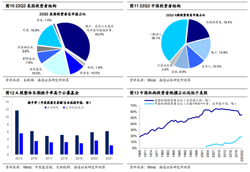 相对美股,A股机构投资者占比偏低。对比美股, A股长期以来投资者结构中散户占比偏高,而机构投资者占比偏低,从交易特征看散户投资者换手率高而机构投资者换手率低,这就导致A股市场波动性比美股更高。根据中国基金报援引天相投顾数据,2021年纳入统计的封闭式、股票型开放式和混合型开放式(不含指数型封闭式、指数型开放式、混合型保本基金)的整体平均换手率为2.41倍,而全部A股为6.19倍,机构投资者换手率处于较低水平。在总市值口径下,我们测算22Q3散户投资者占比为14.8%,法人为38.1%,自然人为10.5%,机构投资者为18.4%,A股机构投资者占比不高,与美国仍有较大的差距。根据美联储数据,22Q2美股市值中散户、自然人及非营利组织持股市值占比为40.0%,机构投资者为59.1%(其中较大的机构投资者如共同基金占比为19.0%、外资为16.8%、养老金为10.0%、ETF基金为7.6%)。美股机构投资者规模如此庞大得益于1980年以来美国以养老金为代表的长线资金入市,机构投资者占比从1970年的20%升至2000年的63%。