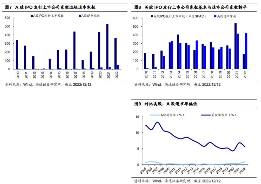 当然,近年来A股退市制度改革也逐步深化并已经取得实质性进展,2021年A股退市20家公司,今年(截至2022/12/12)A股退市公司数已达50家,创历史新高,这得益于2020/12/31沪深交易所正式发布“退市新规”。作为注册制的配套制度,修订后的退市规则已经可以对标美股。修订内容包括:(1)完善退市指标,包括财务类指标、交易类指标、规范类指标和重大违法类指标,(2)简化退市流程,包括取消暂停上市和恢复上市环节,取消交易类退市情形的退市整理期设置,将重大违法类退市连续停牌时点延后。未来随着A股退市制度严格执行,A股有望实现优胜劣汰的自我净化,上市公司整体质量得以提高,优化市场资源配置效率。