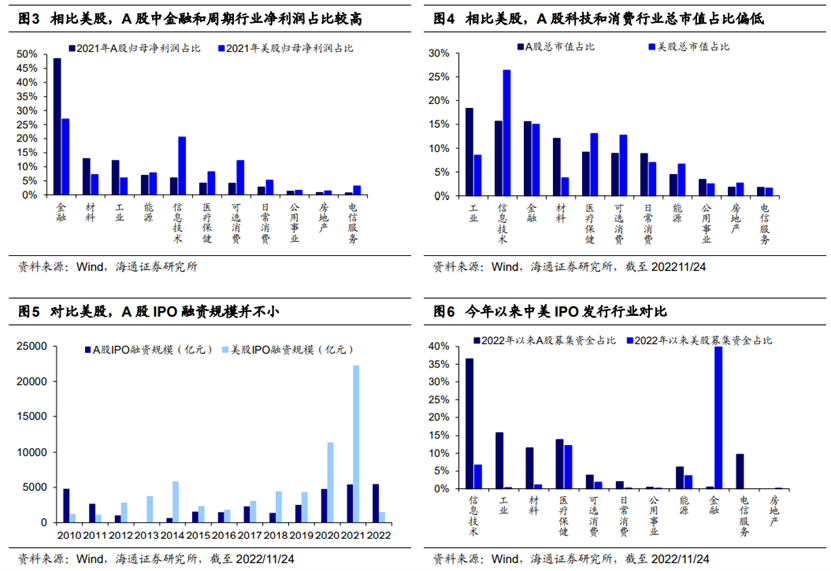 通过全面注册制提高融资主体多元化,反映实体经济结构变迁。对比中美上市公司结构,A股中金融和周期行业占比较高,而美股中科技和消费占比较高。从2021年净利润占比看,A股金融+周期占比为68%,科技+消费为18%,而美股金融+周期为42%,科技+消费为49%。从最新总市值占比看,A股金融+周期占比为32%,科技+消费为44%,而美股金融+周期为25%,科技+消费为61%。长期以来,美股消费和科技行业占比高得益于美国经济结构消费主导和推行注册发行制。