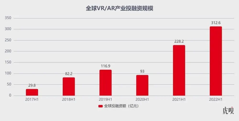根据陀螺研究院的统计数据,2022年上半年,全球VR/AR整体投融资总额为312.6亿元,较去年同期的228.2亿元,同比上升37%。
