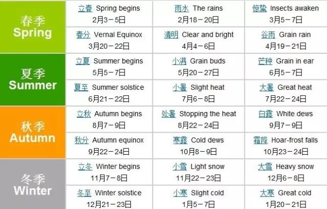 以立春为一年的开始,按先后顺序分别是:春季立春、雨水、惊蛰、春分、清明、谷雨;夏季立夏、小满、芒种、夏至、小暑、大暑;秋季立秋、处暑、白露、秋分、寒露、霜降;冬季立冬、小雪、大雪、冬至、小寒、大寒。