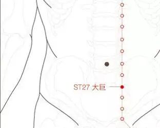 出《针灸甲乙经》。属足阳明胃经。大巨穴位于人体的下腹部,从肚脐到耻骨上方画一线,将此线四等分,从肚脐往下四分之三点的左右三指宽处,即为此穴。