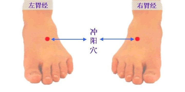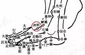 出《灵枢·本输》。属足阳明胃经。冲阳穴,针灸穴位名,乃是足阳明胃经的原穴。在足背最高处,当拇长伸肌腱和趾长伸肌腱之间,足背动脉搏动处。在趾长伸肌腱外侧;有足背动、静脉及足背静脉网;当腓浅神经的足背内侧皮神经第二支本干处,深层为腓深神经。冲阳。冲,穴内物质运动之状。阳,阳气。该穴名意指本穴的地部经水气化冲行天部。主治疾病: 口眼歪斜,面肿,齿痛,癫狂痫,胃病,足痿无力。近人报道还可以治疗脉管炎。