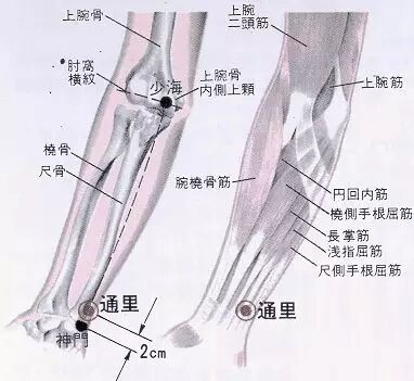 出《灵枢·经脉》。属手少阴心经。通里穴,中医针灸穴位之一,隶属手少阴心经。在前臂掌侧,当尺侧腕屈肌腱的桡侧缘,腕横纹上1寸,在尺侧腕屈肌与指浅屈肌之间,深层为指深屈肌;有尺动脉通过;布有前臂内侧皮神经,尺侧为尺神经。主治心病,舌强不语,暴喑,腕臂痛。操作方法为直刺0.3~0.5寸。
