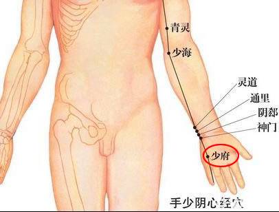 出《针灸甲乙经》。属手少阴心经。少府穴是手少阴心经的穴位之一,该穴名意指本心经气血在此聚集,位于手掌面,第4、5掌骨之间,握拳时,当小指尖处。取穴时仰掌,手指屈向掌心横纹,当小指指尖下凹陷处是穴。此穴可治疗心悸、胸痛、小便不利、遗尿、阴痒痛、小指挛痛等疾病。