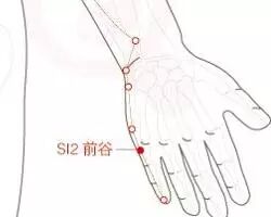 出《灵枢.本输》。属手太阳小肠经。荥(水)穴。在小指尺侧,第五掌指关节前方,掌指横纹端凹陷处,赤白肉际,握拳取穴。一说“在手小指外侧,第二节纹头”(《针灸集成》)。布有来自尺神经的指背神经及指掌侧固有神经,及有自尺动、静脉的指背动、静脉。主治热病无汗,头痛项强,耳聋,耳鸣,目赤,鼻塞,咽痛,痄腮,产后无乳,手指麻木等。直刺0.3-0.5寸。艾炷灸3壮;或艾条灸5-10分钟。