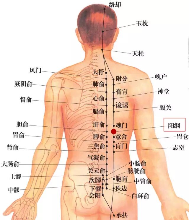 阳,阳气也。纲,网上之总绳也。阳纲名意指胆腑的阳气由此外输膀胱经。阳纲穴与胆俞穴相对,气血物质皆来自胆腑,胆腑气血处半表半里,而本穴又在背外之侧,穴内物质为胆腑外输的阳热风气,此阳热风气即是脏腑外输的阳气汇聚而成,有对体内外输的阳气抓总提纲作用,故名阳纲。