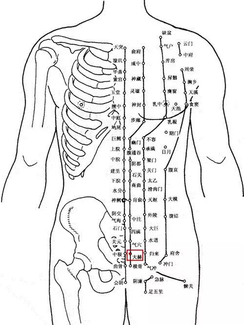 任脉:会阴 曲骨 中极 关元 石门 气海 阴交 神阙 水分 下脘 建里 中脘 上脘 巨阙 鸠尾 中庭 膻中 玉堂 紫宫 华盖 璇玑 天突 廉泉 承浆
