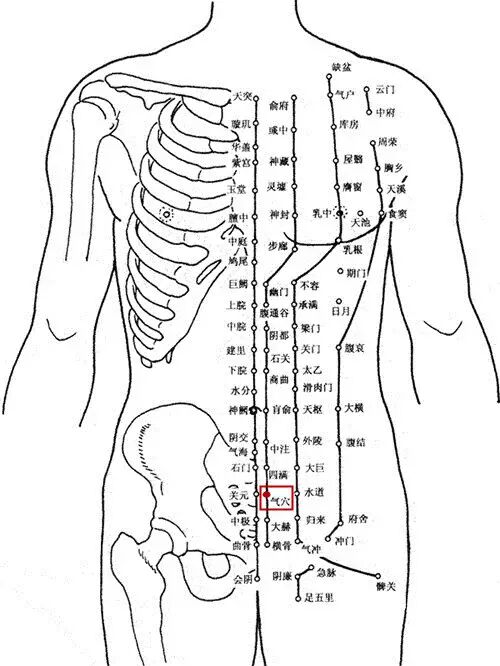 配气海穴、三阴交穴、肾俞穴、血海穴治月经不调、血带、宫冷不孕、先兆流产、阳痿、不育症。