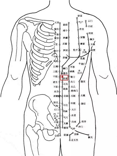 出《针灸甲乙经》。别名食宫。属足少阴肾经。冲脉、足少阴之会。在上腹部,当脐中上4寸,前正中线旁开0.5寸。另说在脐上3寸,旁开0.5寸(《针灸甲乙经》);脐上3寸,旁开1.5寸(《铜人腧穴针灸图经》)。布有第八肋间神经,腹壁上动、静脉。