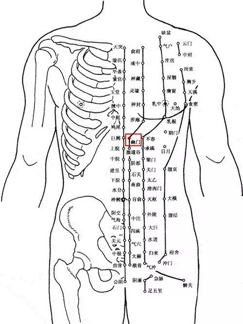 《灵枢·经脉》。位于脐中上6寸,前正中线旁开0.5寸,在腹直肌内缘;布有腹壁上动、静脉;有第6、7、8肋间神经分布。