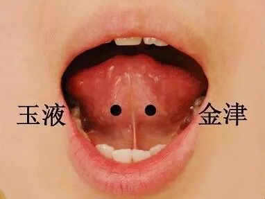 金津穴、玉液穴,出自《针灸大成》。属头颈部奇穴。位于口腔内,舌下系带两旁之静脉上。左侧称金津,右侧称玉液。