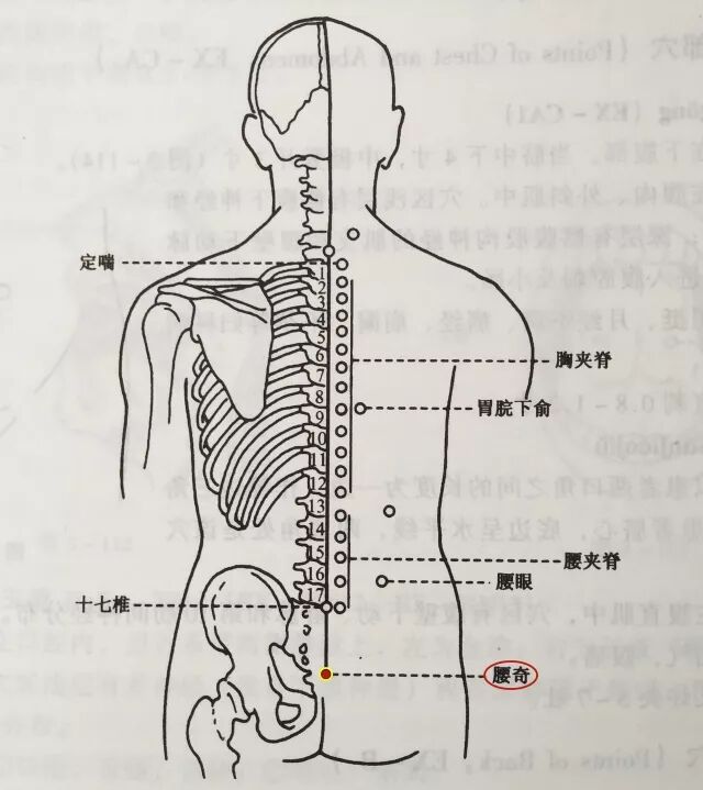 按摩手法:用大鱼际揉按腰奇穴,以局部有酸胀感为宜,一天一次,可以治腰脊强痛、便秘、坐骨神经痛等。