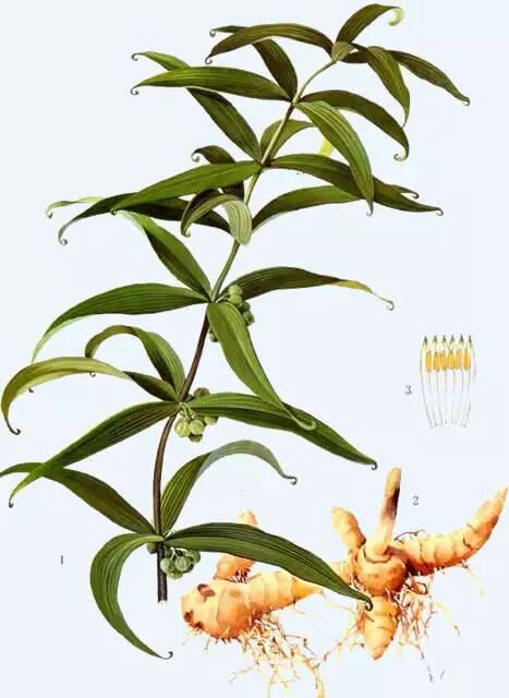黄精是否有那么神效,这里不去评说,只当一神话来看。根据历代本草书的记载总结起来,黄精具有补气养阴、健脾润肺益肾的功效。可用于脾胃虚弱,体倦乏力,口干食少,肺虚燥咳,精血不足,内热消渴等症。现代药理研究表明,黄精含有黄精皂苷、烟酸、糖类、醌类、氨基酸及微量元素,具有抗衰老、降血糖、降血脂、提高和改善记忆、抗肿瘤、调节免疫、抗病毒、抗炎等作用。