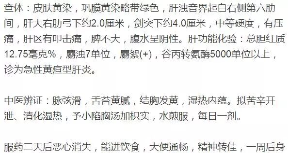 目发黄大减,复查总胆红质迅速降至1.8毫克%,谷丙转氨酶降至1500单位,自觉无明显不适,继续服用上方一周,身目黄疸全消,总胆红质降至1.1毫克%,谷丙转氨酶降至200单位,仍按原方再服一周,复查肝功能全部正常而出院。