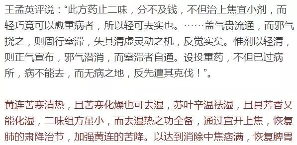 黄连配苏叶,原载薛生白《湿热病篇》,该篇说:“湿热证,呕恶不止,昼夜不差,欲死者,肺胃不和,胃热移肺,肺不受邪也,宜用川连三四分、苏叶二三分,两味煎汤,呷下即止。”
