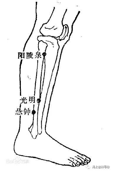 3.光明穴,针刺右侧光明穴(人体的小腿外侧,当外踝尖上5寸,腓骨前缘),得气后症状明显好转,功能基本恢复,留针20分钟。临床治愈。
