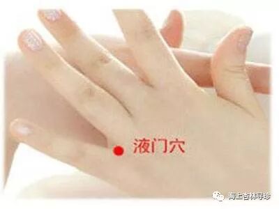 2.液门穴(左)。采取3寸毫针以液门穴透中渚穴,行强刺激,同时令病人前后左右活动颈部,5分钟后活动自如,留针20分钟压痛点消失。