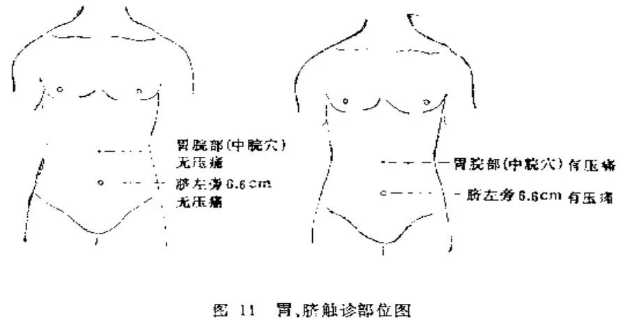 后者指触按胃脘部,相当于中脘穴部位和脐左距脐2寸(3横指)左右处,有无板滞感和压痛。正常人腹软而平坦,无压痛,如出现胃脘板滞压痛,应考虑停饮或食积;脐左触之坚硬而有压痛,是肝郁气滞的明显标志,提示肝气郁结、癥瘕积聚。两触在以化瘀驱毒攻下为原则的肿瘤治疗中,具有非常重要的诊断意义。“胃脐压痛就是行气破瘀攻下的依据,这是必须明确的。”“如果没有两触的阳性,是断然不敢用大剂破瘀攻下的。”
