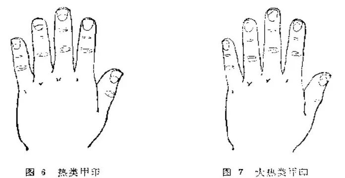 ②热型:甲印变大或有甲印的指数增多,均属热型甲印。按程度不同也可分为偏热、热、大热3型。8个手指的中印大小正常或略大,又见1个或2个小指有甲印(一般较小)为偏热型;9指以上有较大甲印(均在2mm以上),或除2小指甲印较小外,余8指甲印均大于正常者为热型;10指都有特大甲印(超过甲体的1/2)为大热型。