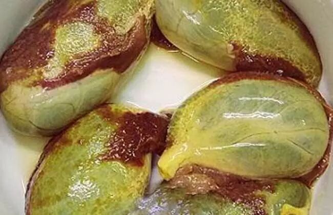 猪胆内装满黑豆,蒸熟,晒干,每次服二十至三十粒,一日两次,治高血压。