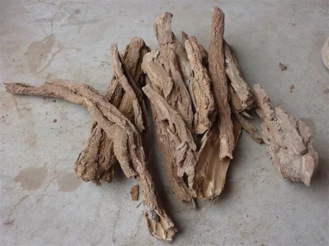 为萝藦科植物杠柳的干燥根皮。呈卷筒状或槽状,少数呈不规则块片状,长3~10cm,直径1~2cm,厚2~4mm,外表面灰棕色或黄棕色,栓皮易成片状脱落,内表面黄白色或淡红棕色,有细纵纹,质地疏松而脆,易折断,断面黄白色,不整齐。有浓厚的香气,味苦,稍有麻舌感,香加皮性温,味辛苦,有毒,祛风湿、壮筋骨、强腰膝,现代研究表明它具有强心作用。