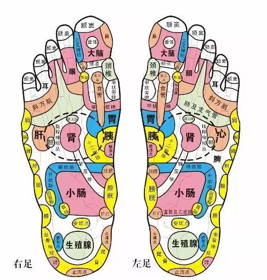 人体有6条主要经络在双足分布并相互交会,有40多个穴位与机体沟通。