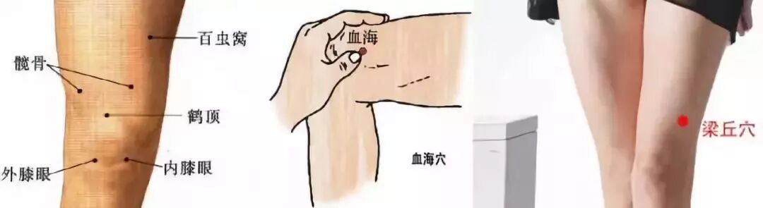 ▲内外膝(膝盖窝下面两个眼)、血海(膝盖上面两指内侧)、梁丘(膝盖上两指外侧)用力按,对髌骨软化很有作用。