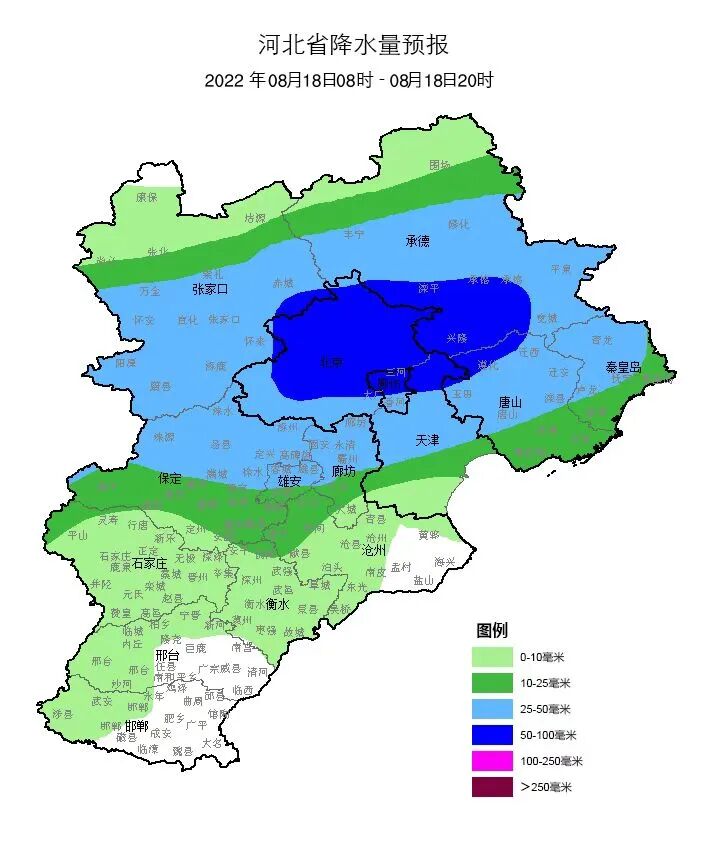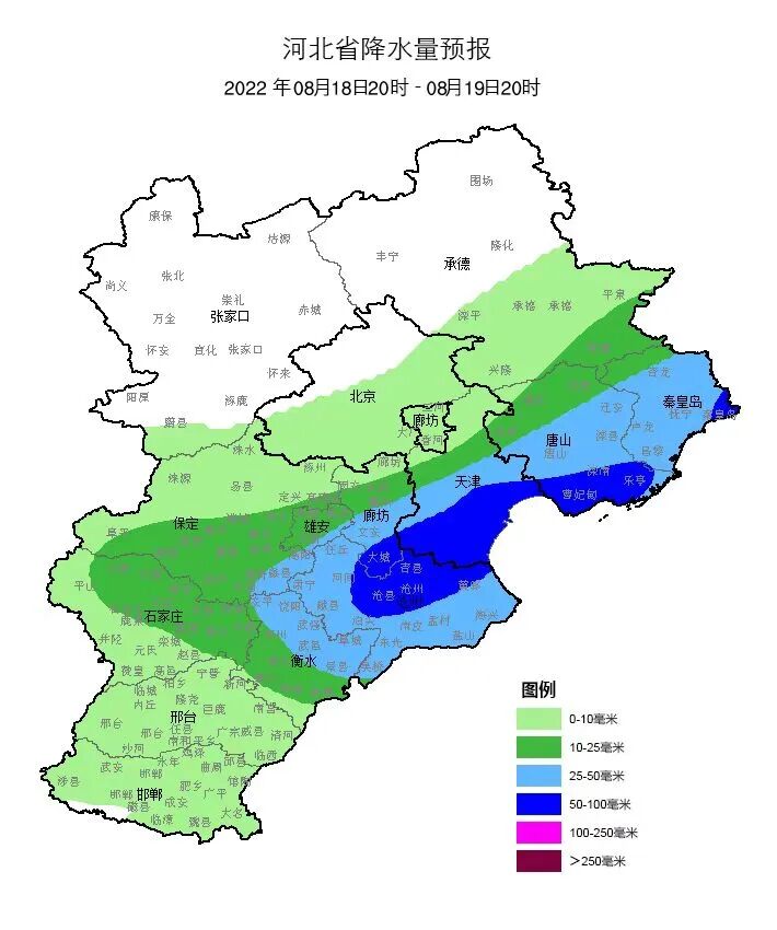 据省气象台预报,8月17日夜间到19日我省将有一次明显降雨过程,主要降雨时段集中在18日凌晨到夜间,保定、沧州及以北地区和衡水西部有中到大雨(20-40毫米),其中张家口南部、承德南部、廊坊北部、唐山、秦皇岛、沧州北部的部分地区有暴雨(50-80毫米),个别地点有大暴雨(100毫米以上);其他地区有雷阵雨,雷雨时局地伴有短时强降水、短时大风等强对流天气,最大雨强30-50毫米/小时。