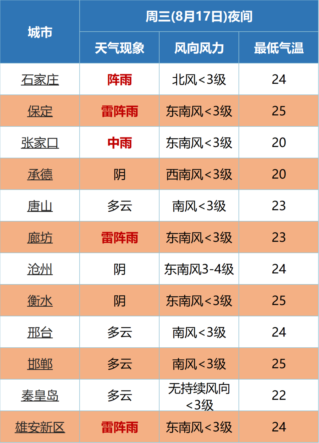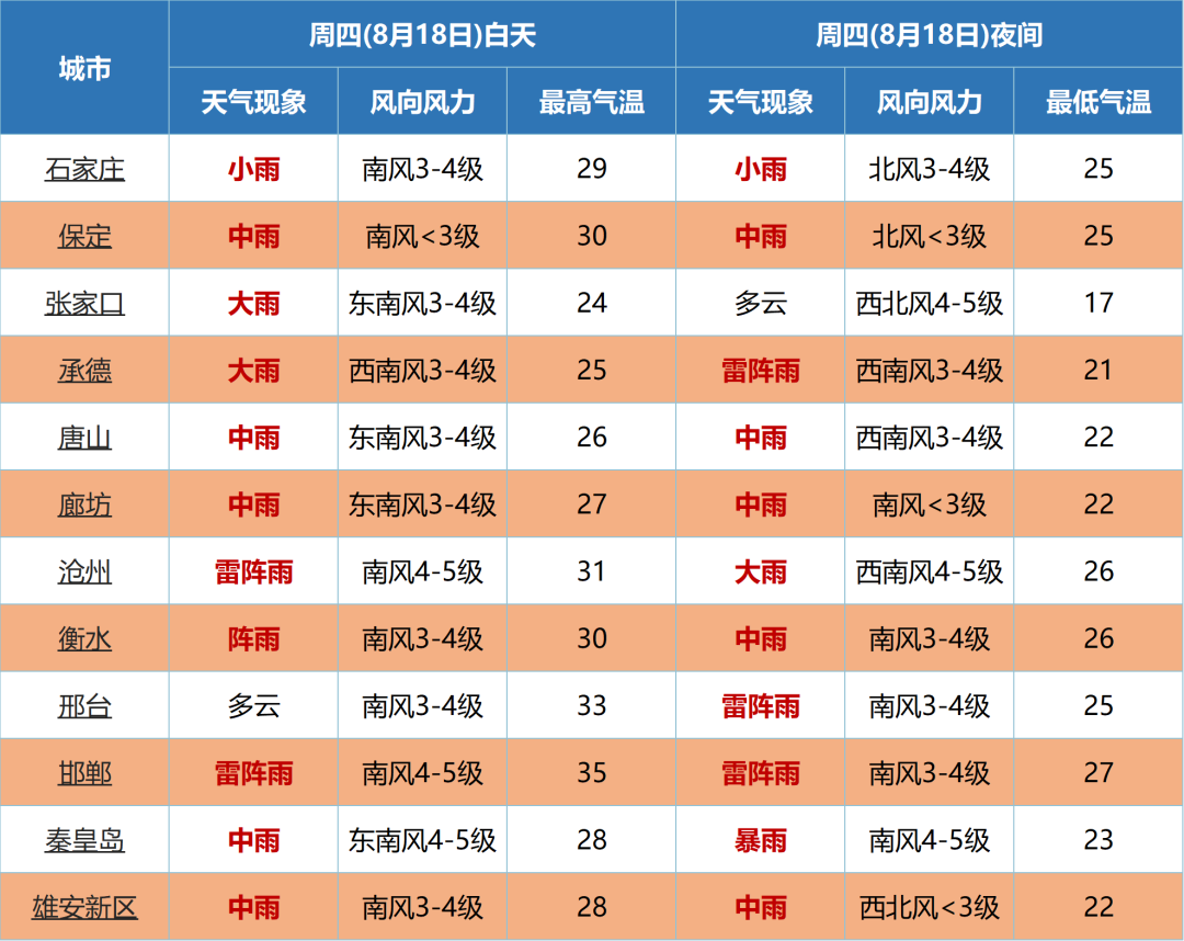 明天夜间到19日,张家口、承德西部阴转多云,其他地区阴有雷阵雨或阵雨转多云,其中唐山、秦皇岛、保定东部、雄安新区、廊坊、石家庄北部、沧州、衡水有中到大雨,局地有暴雨,个别地点有大暴雨,雷雨时局地伴有短时强降水、短时大风等强对流天气。