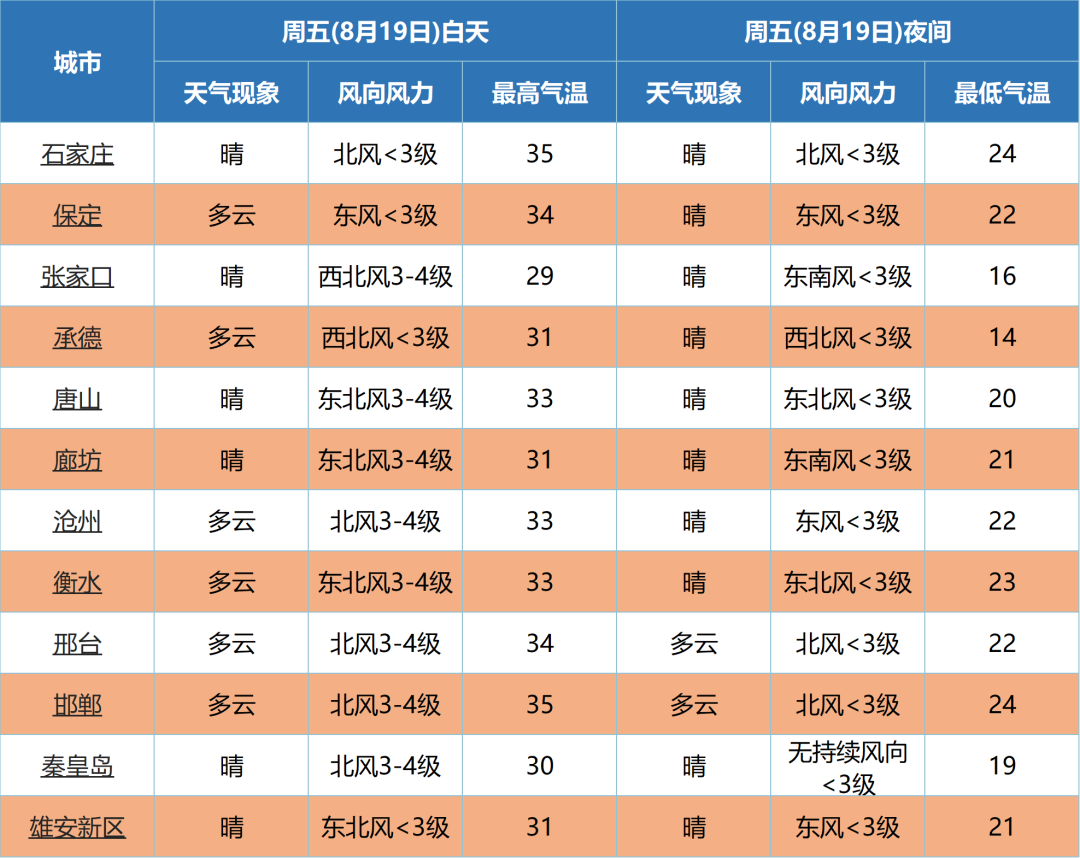 明天白天,张家口南部、承德南部、唐山、秦皇岛、保定、廊坊、雄安新区、沧州北部阴有中到大雨,局地有暴雨,邢台东部、邯郸东部多云转阴,其他地区多云转阴有雷阵雨,雷雨时局地伴有短时强降水、短时大风等强对流天气。最高气温,石家庄、沧州及以南地区30~34℃,其他地区20~29℃。