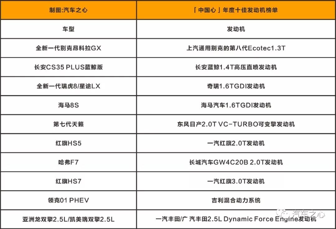 另一份由国内汽车杂志《汽车与运动》发布,名为「『中国心』年度十佳发动机」,面向国内自主品牌与合资品牌的发动机。