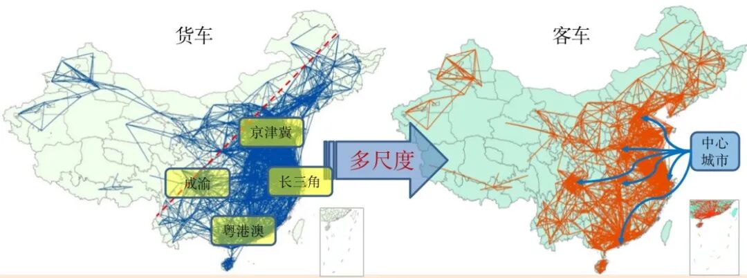 图左是货车车流,图右是客车车流。从图中很明显可以看出来,以资源型城市为主的京津地区“货”流动大。而从代表人的经济活动的客车车流来看,长三角明显“人”流动大。